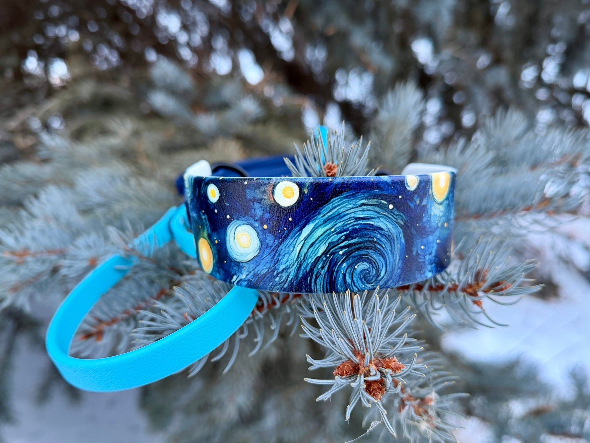 - Starry Night 1.5" UV printed Biothane with a navy blue leash & ring loops, baby blue handle and slider (black hardware). 13" when rings touch. Leash length 5' 3"