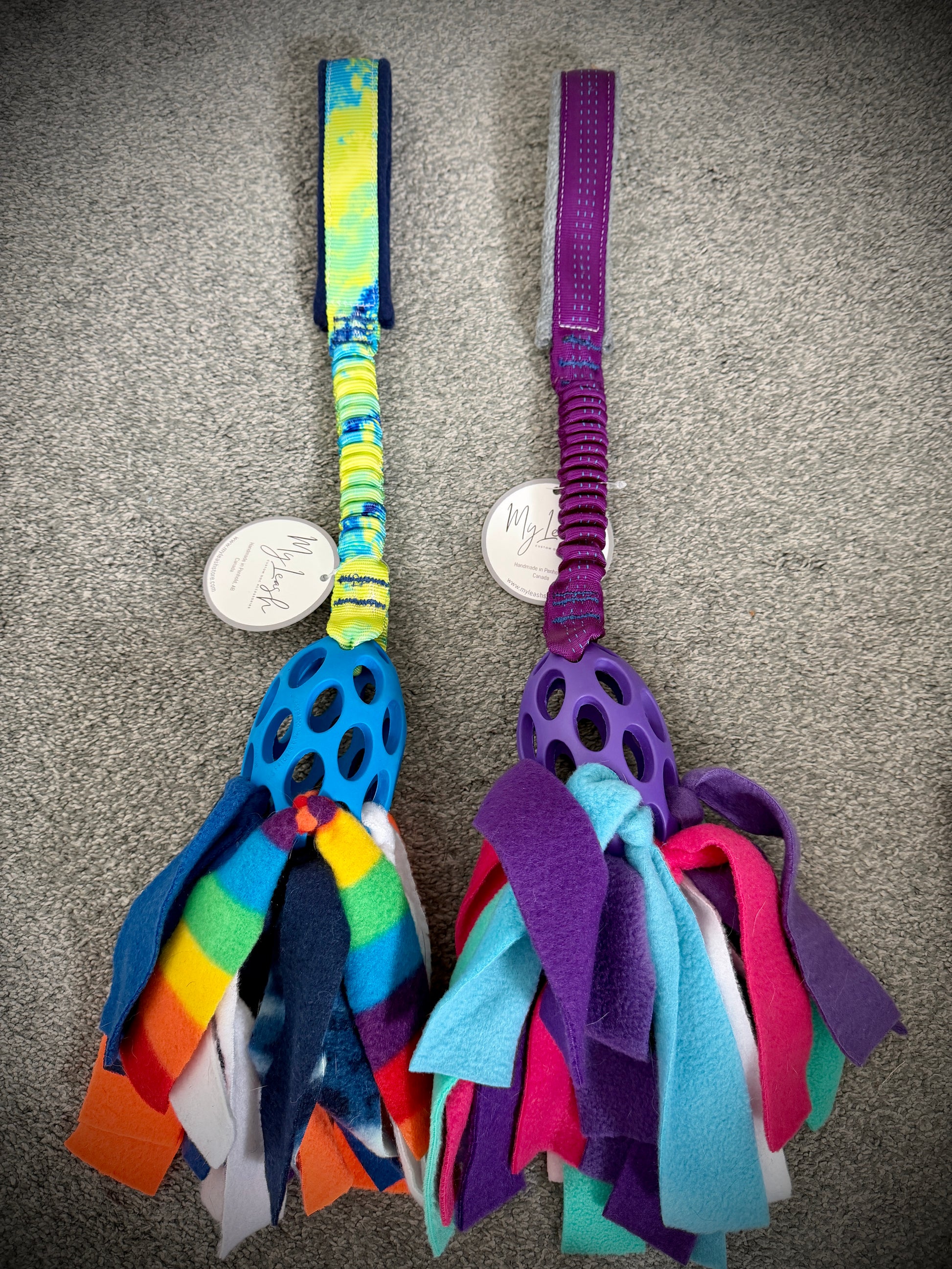 The Tangle Football Tug is made with a Holee Roller Football on an aircraft rated bungee, soft fleece for your hands and some floppy, fleecy mop!